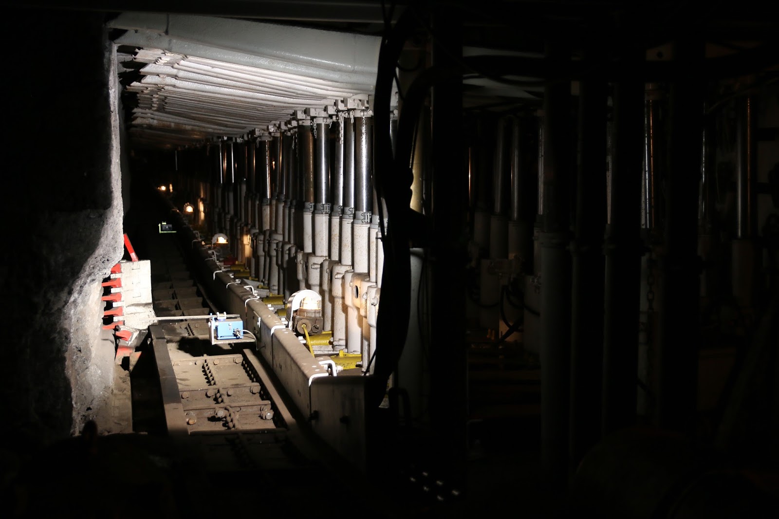 Ściana wydobywcza zabezpieczona hydraulicznymi sekcjami.